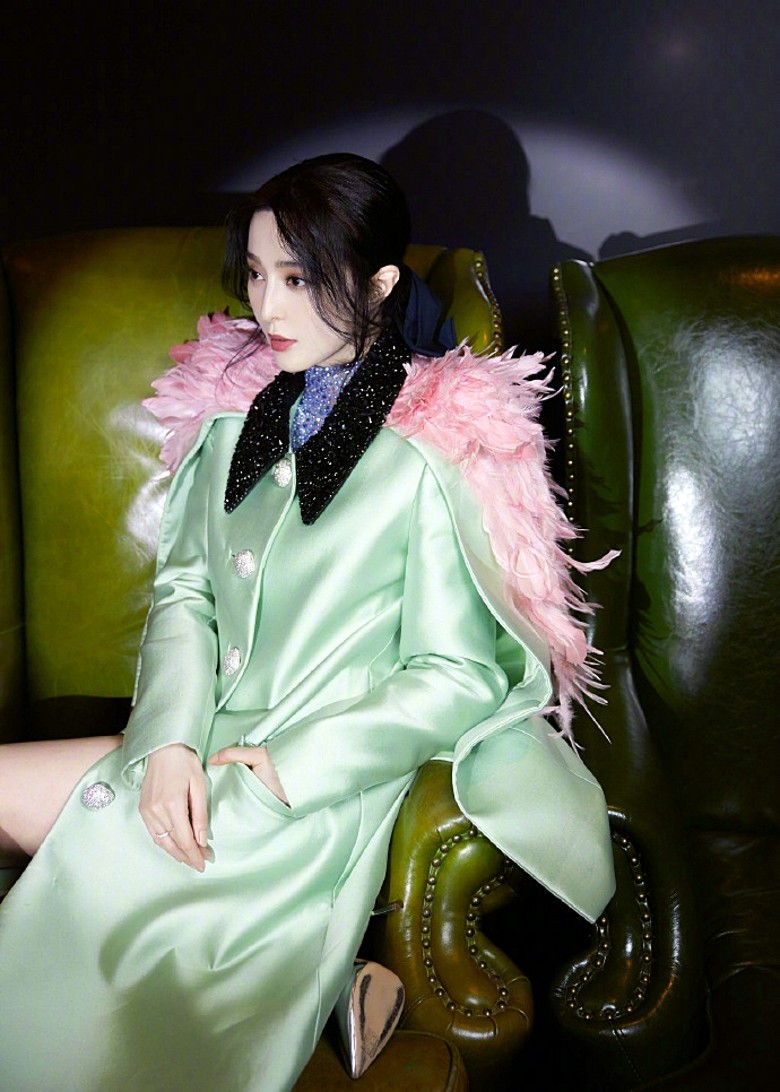 坐在梳化的幾張是沒問題的,而且散發著范爺的魅力超美!范冰冰紮起頭髮,精緻妝容襯托出雪白鵝蛋面,內襯紫色高領上衣,外加綠色大衣,黑色衣領、粉色羽毛披風格外凸顯范爺霸氣。