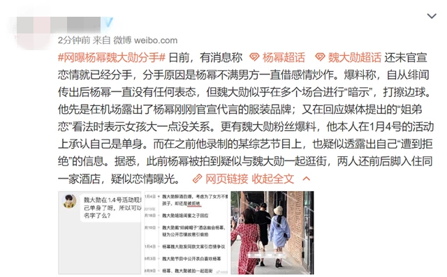 而近日又有魏大勛的粉絲爆料指,他在1月4日活動上承認自己目前是單身,而在之前錄影的某綜藝節目上,疑似透露出自己「遭到拒絕」,令人猜測二人感情破裂!而分手原因是楊冪不滿男方一直借感情炒作新聞!