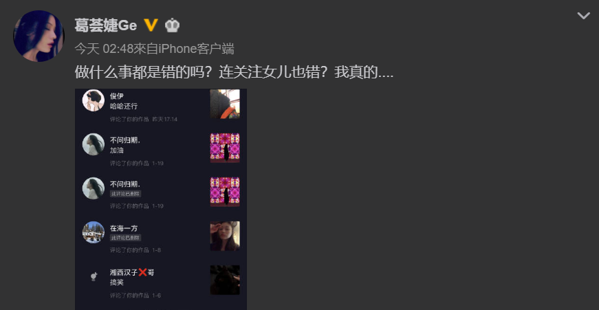 就在今日凌晨,葛薈婕忽然在微博大爆:「做甚麼事都是錯的嗎?連關注女兒也錯?我真的……」