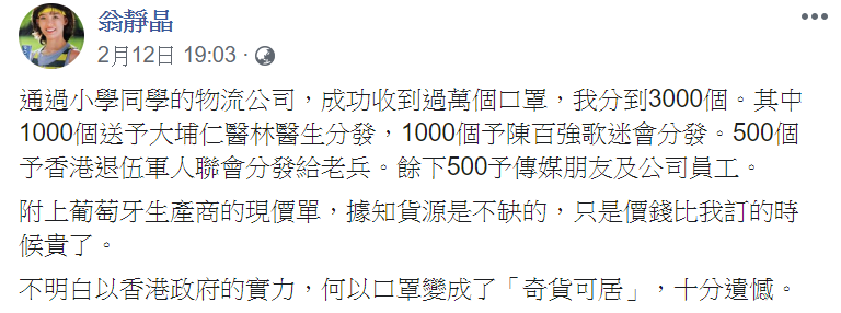 她寫道:「通過小學同學的物流公司,成功收到過萬個口罩,我分到3,000個。其中1,000個送予大埔仁醫林醫生分發,1,000個予陳百強影迷會分發。500個予香港退伍軍人聯會分發給老兵。餘下500予傳媒朋友及公司員工。附上葡萄牙生產商的現價單,據知貨源是不缺的,只是價錢比我訂的時候貴了。」