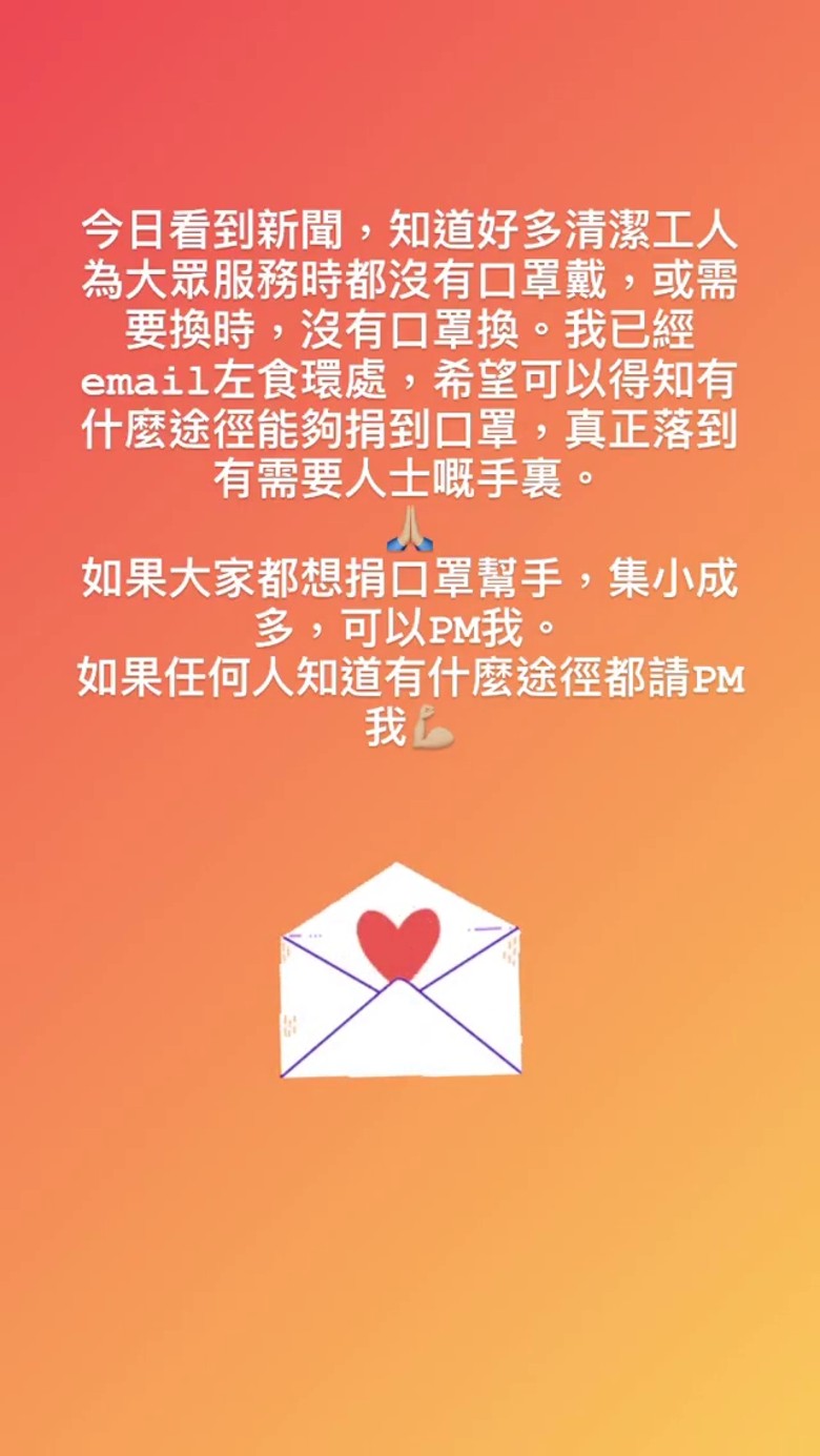 張名雅還透露有好多人私訊她說願意捐口罩,好感謝大家支持她的大計,更稱正考慮緊把目標擴展到清潔工人等。