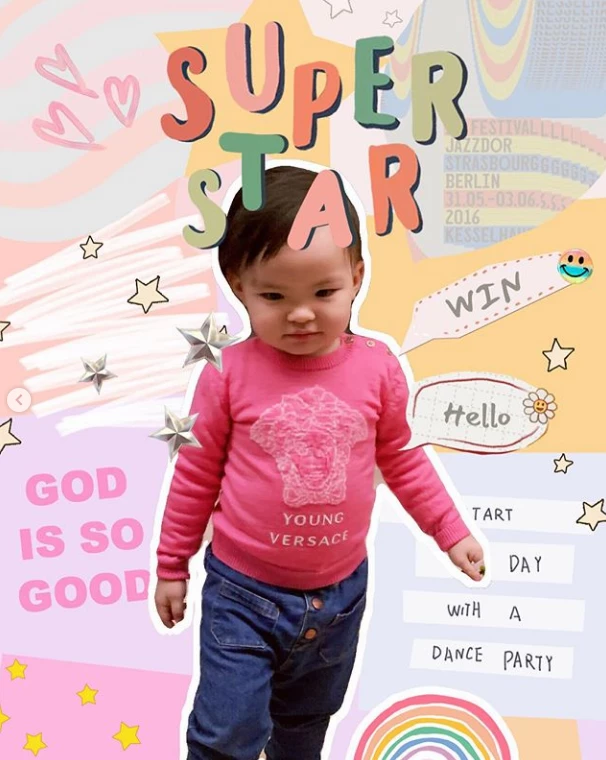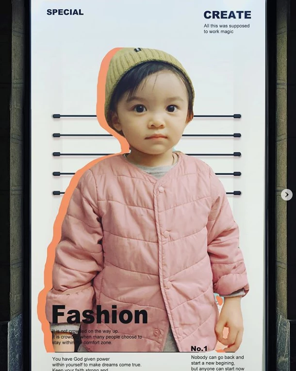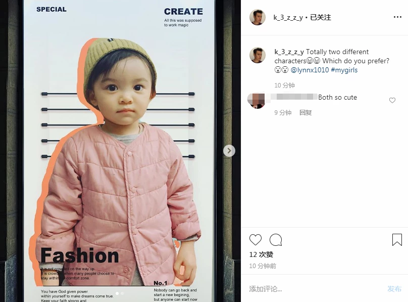 這次爸爸雖然給女兒P上了「雜志封面」的背景,家姐Kaylor戴著毛線帽子,身穿粉色棉襖,大眼睛依舊最搶鏡!