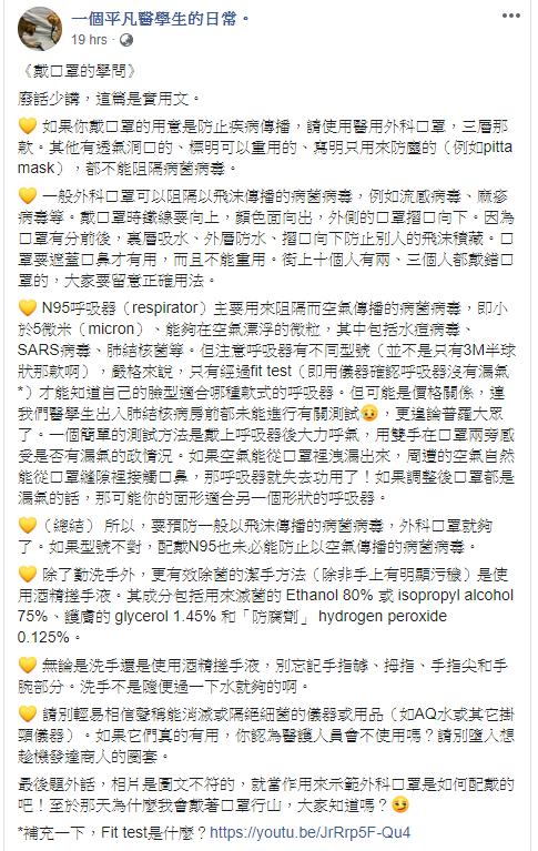 不過,帖文亦較導市民可自行用呼氣測試所用的N95口罩有否漏氣。當戴上口罩後,雙手在口罩兩旁感受是否有漏氣的情況。如果有空氣從口罩泄漏出來,周遭的空氣自然能口罩縫隙裡接觸口鼻,代表口罩失去功用。如果調整後口罩後,仍然漏氣的話,就即再試另一個形狀的口罩,因為如果型號不對,戴上N95亦未必能防止病菌病毒。