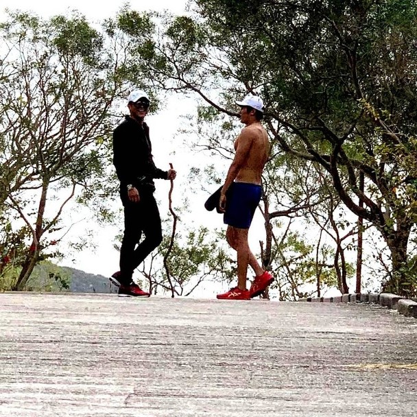 生得高大靚仔嘅馬在驤,赤裸上身大騷胸肌,令着晒外套嘅馬德鐘即時比下去,馬德鐘說:「終於可以行山樂,感謝私人攝影師@江你MarjorieKaren。」