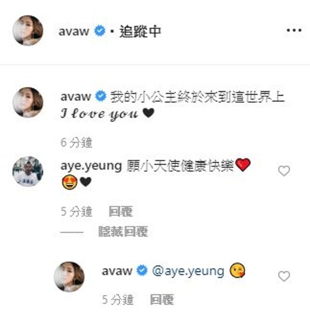 今日佢喺社交網宣布生咗,上載囡囡腳相,留言透露正式做媽媽:「我的小公主終於來到這世界上,I Love You!」