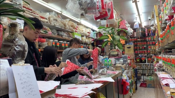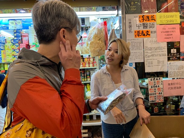 午後的陽光穿透玻璃天花,藥房洋溢着溫暖親切的氣氛。派發活動於下午開始,有街坊預早排隊等候。林先生和義工們遞上湯包後,均會耐心解釋煲的方法。他和街坊有講有笑,十分熟落,因為基乎每位客人都是看着他長大的。
