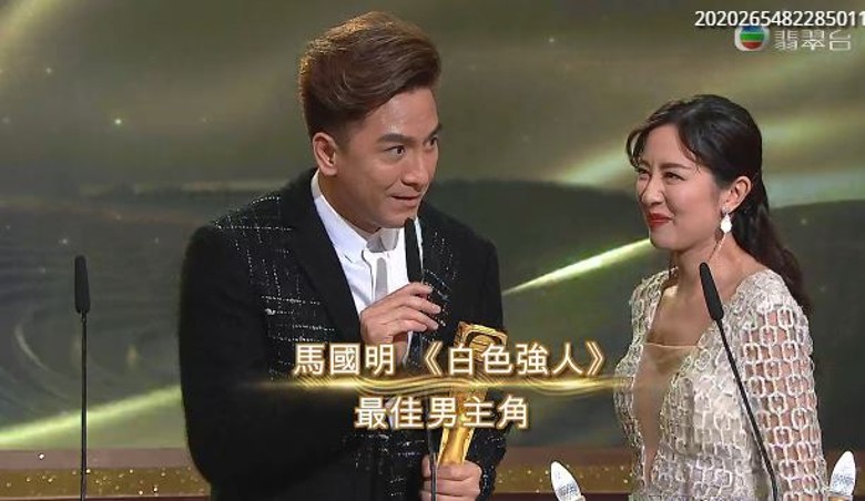 馬明上台說:「今年真係嚇親!我首先多謝大家反應!就算冇獎我都當贏!我今早出門,我阿媽話中到就發,我話中都要做,佢話八千幾萬呀!今年咁多強對手,可能我係有運,呢個運係遇到《白色強人》。」