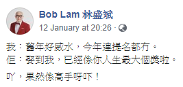 Bob上載了他與Pearl的對話:「我:舊年好威水,今年連提名都冇。佢(老婆Pearl):娶到我,已經係你人生最大個獎啦。吖,果然係高手呀吓!」