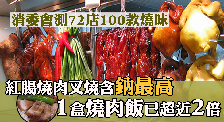 食物安全中心的測試發現,該4種食物屬「高鈉」食物,紅腸樣本的鈉含量超出食物鈉含量的參考水平。在100款測試食物樣本中,只有兩款屬「低鈉」。消委會建議食肆改良製作過程及轉變配料,減少燒味和鹵味食物的鈉含量。