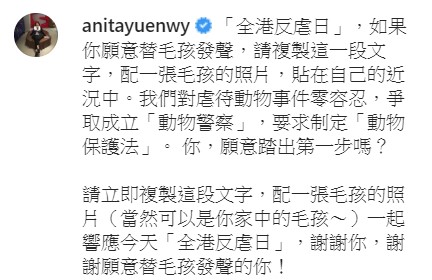 她於社交網上載狗狗近照,並轉發有關文字,指對虐待動物事件零容忍,希望爭取成立「動物警察」、要求制定「動物保護法」,以及全力支持1月23日「全港反虐日」等。