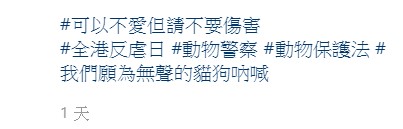 她又表示:「可以不愛但請不要傷害,我們願為無聲的貓狗吶喊。」