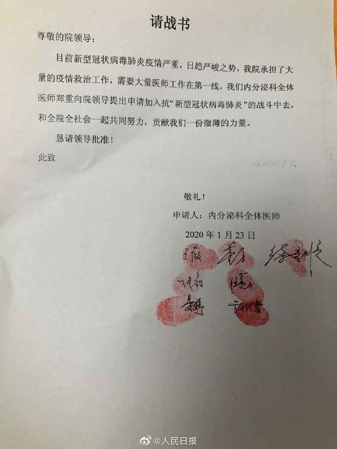 據《人民日報》報導,武漢市江夏區人民醫院有7名內分泌科醫生主動申請調去呼吸科前線,表示目前醫院承擔大量疫情救治工作,願意參與各項病毒性治療,聽從醫院的調配指示,並稱不計生死。他們昨日印了一封「請戰書」,並簽名、按上紅色手印,希望貢獻微薄的力量。
