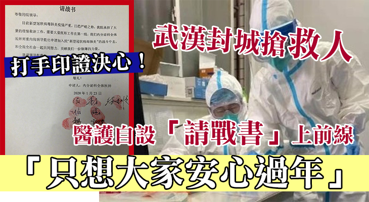 由於武漢肺炎的病情逐漸擴大到不同地區,加上武漢政府已宣佈封城,以免其他帶菌者會傳到其他地方,難以控制病情的狀況。而多位醫護人員都願意走到前線救人,甚至揚言為救人都可以犧牲自己。可見其醫者決心之偉大。