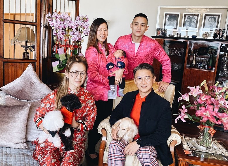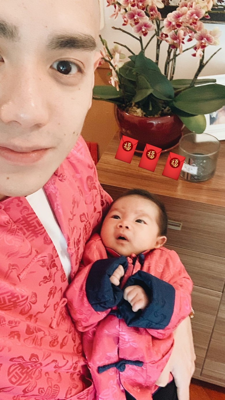 Jon喺社交網大晒多張合照,見佢哋一家三口着上粉紅色家庭唐裝衫,相當溫馨!
