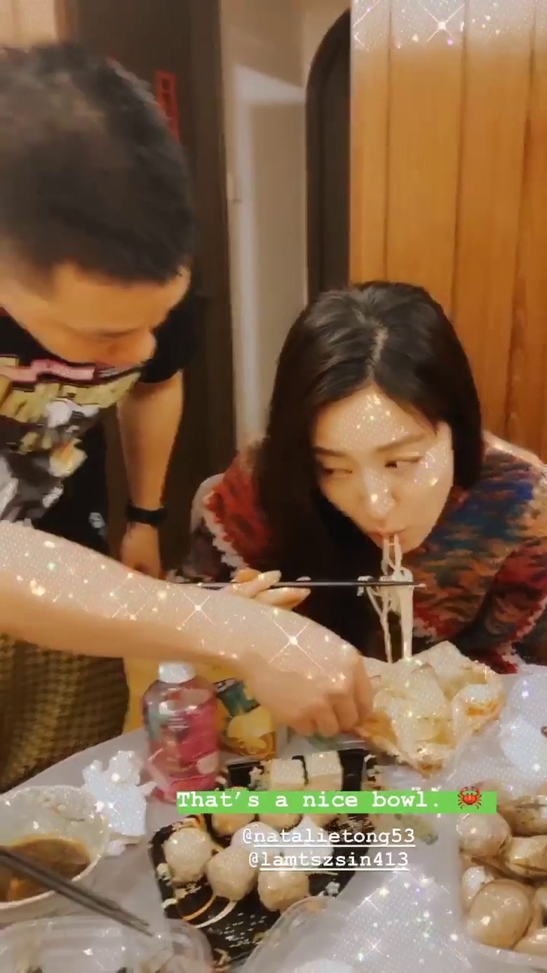 雖然唐詩詠不吃牛,但都還有很多東西吃,正當她吃完長腳蟹之後,更用個大蟹蓋來裝麵食,啱啱走過的林子善就搞笑問她個碗在哪兒買,唐詩詠就答:「竹地。」
