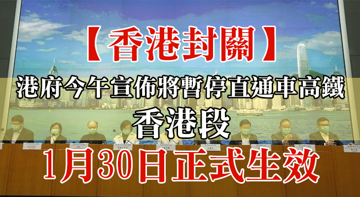 武漢新型冠狀病毒肺炎疫情不斷擴散,特首林鄭月娥今午(28日)宣布多項防疫措施,為大幅度減少兩地往返人流,中央政府已同意會暫停發出個人遊的簽注,並會大幅縮減兩地海陸空交通服務,包括高鐵香港段、紅磡城際直通車、沙頭角及文錦渡口岸均暫停服務;與內地往來的航班亦會減半;中國和澳門客運碼頭的跨境渡輪服務暫停,並會減少跨境巴士的班次。措施由本月30日凌晨生效。