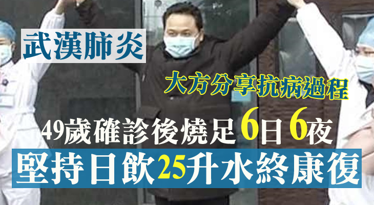 武漢肺炎迅速蔓延至全國,幾千人患上新型冠狀病毒,不過也有少數人痊癒。江西市萍鄉一名49歲陳姓男子早前確診新型冠狀病毒,曾持續發燒6日6夜,經治療後於1月27日出院。他大方分享抗病過程,表示每日堅持喝50斤水(約25公斤,即25升),加上在醫護人員的悉心照料下,終成功抗病,目前已出院在家休養。