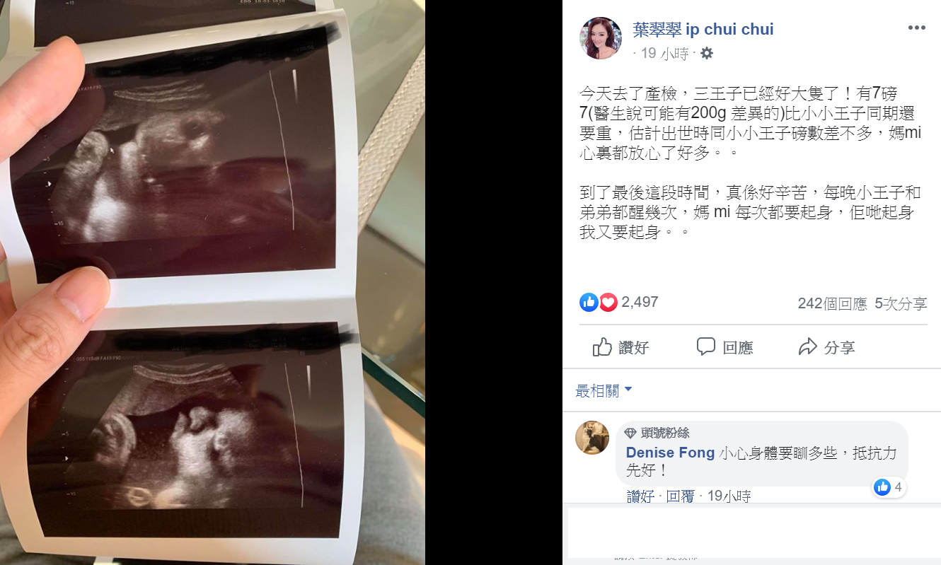 今日翠翠往產檢後,在社交平台曬「三王子」的超聲波照片,寫道:「今天去了產檢,三王子已經好大隻了!有7磅7(醫生說可能有200g差異的)比小小王子同期還要重,估計出世時同小小王子磅數差不多,媽mi心裏都放心了好多。最後這段時間,真係好辛苦,每晚小王子和弟弟都醒幾次,媽mi每次都要起身,佢哋起身我又要起身。」