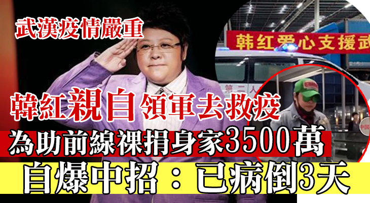 2020年1月31日凌晨0時06分,內地國寶級歌手、前空軍少校韓紅發了一條微博:「說實話,不瞞大家,我病倒了,三天了,但是在國家有難的時候,我必須像個軍人一樣的堅強着!我永遠都是那個笑呵呵的空軍士兵!」