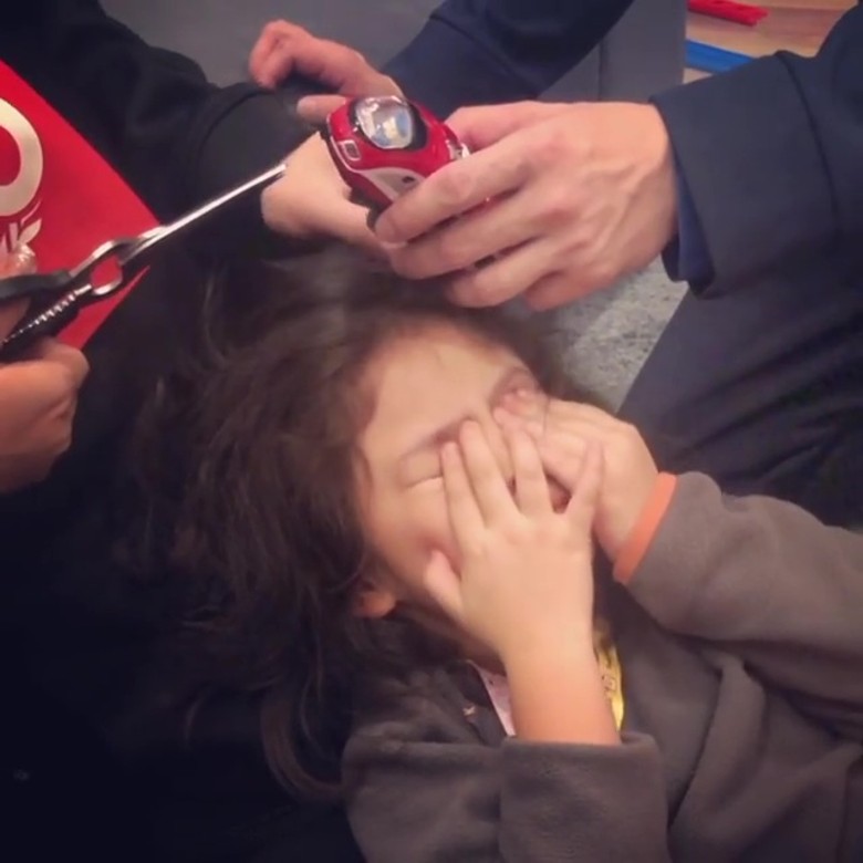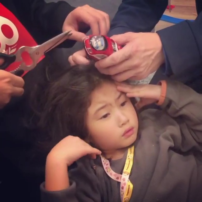 媽媽鄭希怡就在社交網上載小意外的過程相片和片段;原來是因為梁浸浸將兩架玩具車放在頭上玩,不小心將頭髮捲入車轆內翹實未能分開,最後需要向母親求救,最後無法可施下,迫於無奈需要用鉸剪將頭髮削掉才能分開。