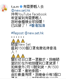歐陽巧瑩早前宣佈今年3月約滿無綫,目前正與老公林師傑及另外兩位朋友開設新YouTube channel,今晚歐陽巧瑩與林師傑都轉發消息,表示終於成功從外地購入1,500個口罩,將會抽籤免費派給香港人。