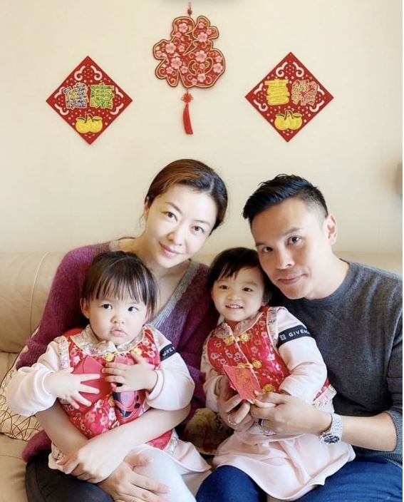 在大年初七就貼了一家四口的賀年相,一家紅噹噹穿了紅色元素的服飾,而一對女兒繼續以孖女裝示人,
