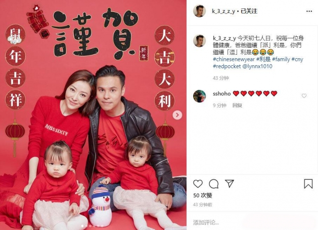 另一幅全家福就是Kaylor及Lyvia穿了賀年服飾,小手拎住利是,而郭可頌就留言:「今天是初七人日,祝每一位身體健康,爸爸繼續『派』利是,你們繼續『逗』利是。」