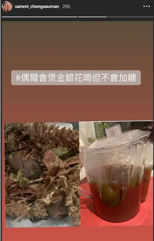 當天晚上,Sammi的社交網上載了一張金銀花涼茶照片,留言「偶爾會煲金銀花喝但不會加糖」。因此,當日她和許志安去中藥鋪買金銀花,完全說得通,這名「年輕神秘」女子很大可能是Sammi!