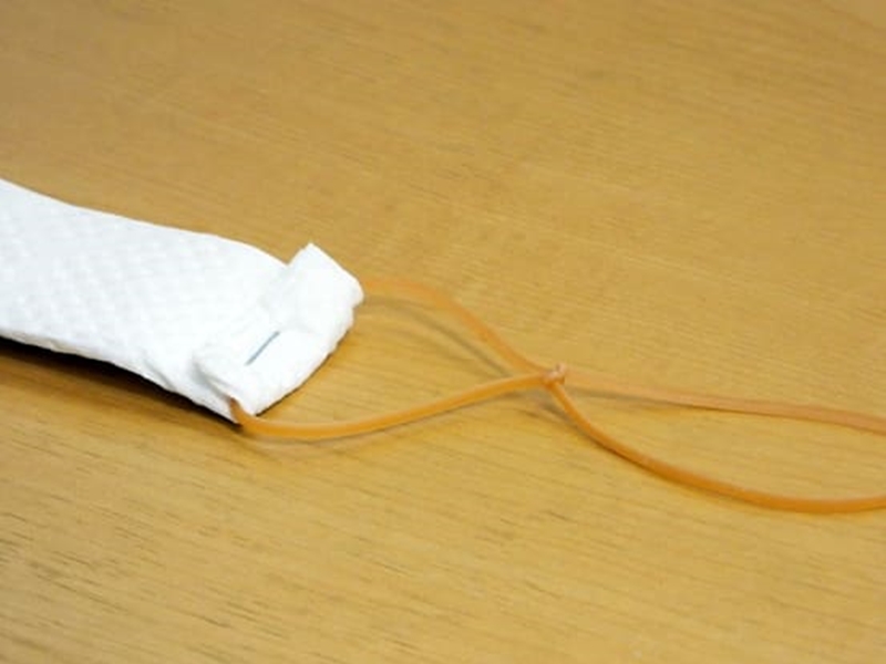 7. 在口罩左右兩邊摺起一小角,然後套入橡筋。
