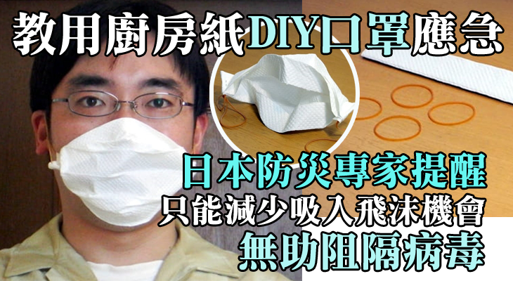 武漢肺炎疫情持續蔓延,香港全城出現搶口罩潮,不少市民紛紛抱怨難買口罩,情況令人憂慮。日本有防災專家近日在網上分享,教授市民利用廚房紙自製口罩,作為應急之用。但他亦再三強調,這個方法只屬地震後的應急辦法,只能減少吸入飛沫的機會,無助阻隔病毒。