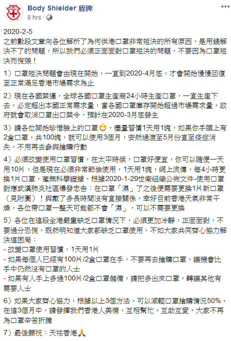 「盾牌」指口罩短決問題會由現在開始,一直到2020年4月底,才會開始慢慢回復至正常滿足香港市場需求為止,又指現在各國禁運,全球各國口罩生產商24小時生產口罩,一直生產下去,必定超出本國正常需求量,當各國口罩庫存開始超過市場需求量,政府就會取消口罩出口禁令,預計在2020年3月底發生。