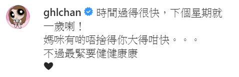 她留言說:「時間過得很快,下個星期就一歲喇!媽咪有啲唔捨得你大得咁快。。。不過最緊要健健康康」