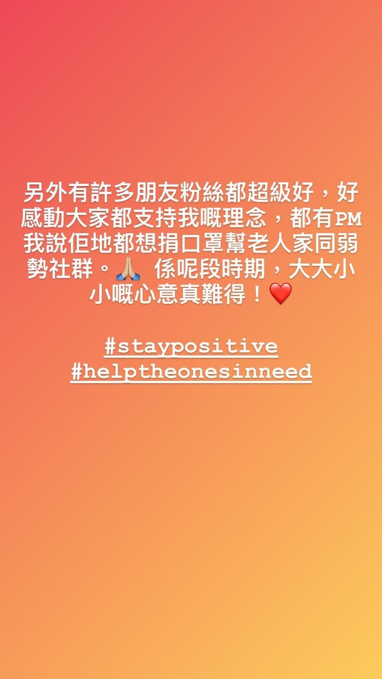 張名雅還透露有好多人私訊她說願意捐口罩,好感謝大家支持她的大計,更稱正考慮緊把目標擴展到清潔工人等。