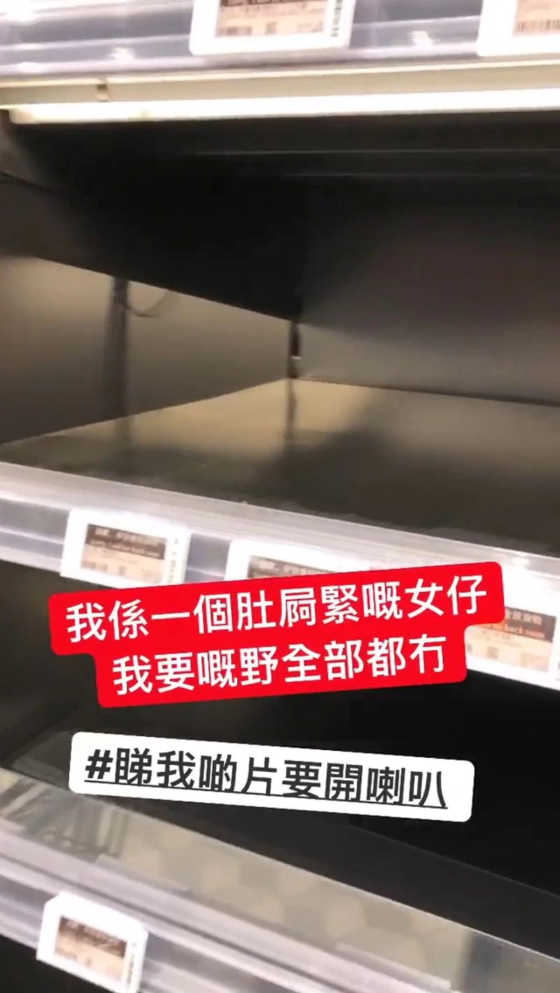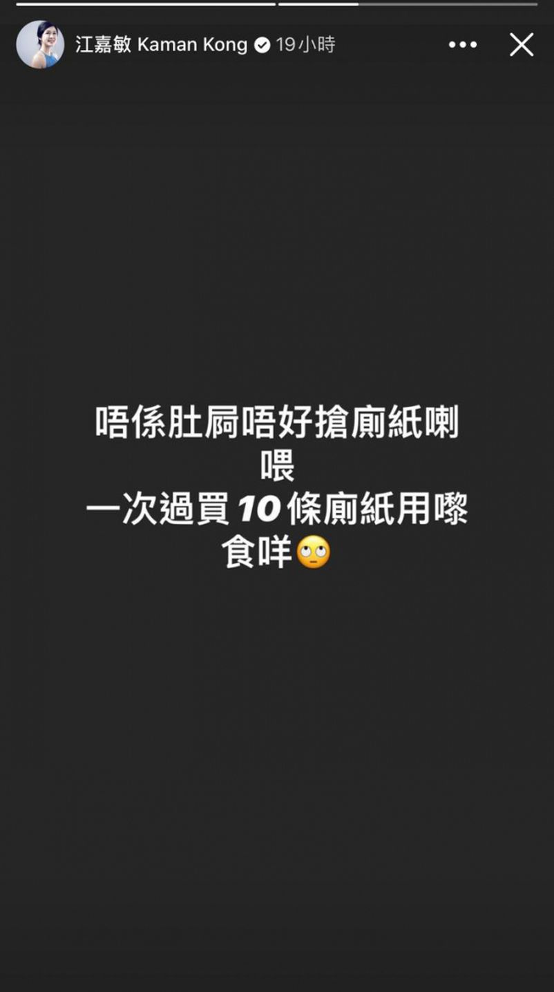 江嘉敏之後貼出超市貨架的片,發現廁紙的貨架一掃而空,她叮囑一定要開聲聽:「我想話畀大家聽,我係一個肚屙緊嘅女仔,我要嘅紙巾、M巾但係全部都冇!想點先?」接着她又說:「唔係肚屙唔好搶廁紙喇!喂!一次過買10條廁紙用嚟食咩!斷估啲人唔係買啲夜用M巾嚟當口罩用呀嘛!」