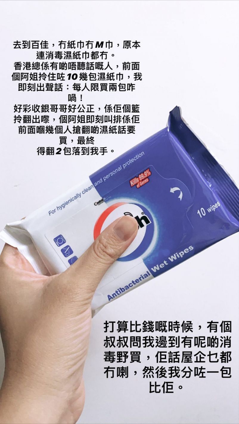之後有超市紛紛為了不再讓市民大量搶購,而增設了連紙巾等用品都要限買,不過江嘉敏經過一輪辛苦後排隊付錢,發現前方有位太太拿了10多包濕紙巾,她最後忍不住出聲話:「每人限買兩包喎!」,並指幸好收銀哥哥好公正,在太太的購物籃拿走多餘份量;最後她還說:「打算畀錢嘅時候,有個叔叔問我邊度有呢啲消毒嘢買,佢話屋企乜都冇喇,然後我分咗一包畀佢!」