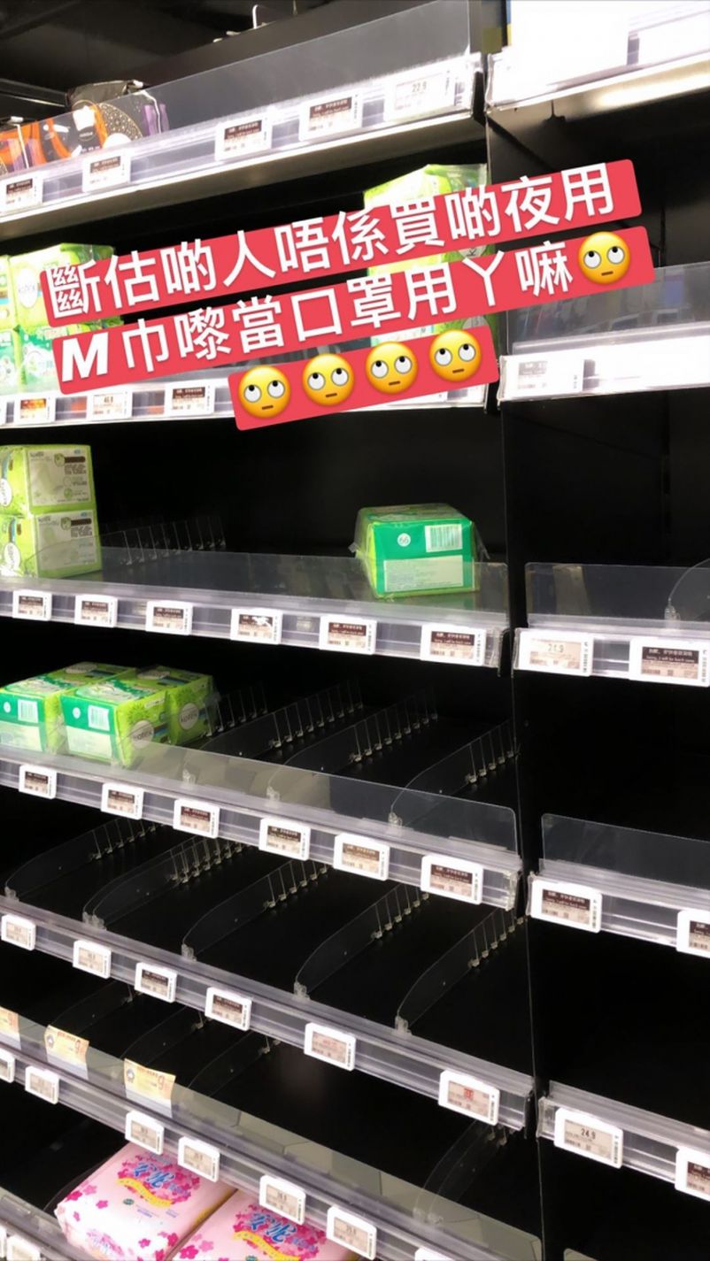 武漢肺炎肆虐香港,市民擔心會出現社區爆發,紛紛到超級市場及藥房搶購大量口罩,昨日網上流傳大陸將停止廁紙供港後,連廁紙、紙巾都被搶購一空。