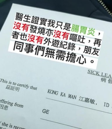 江嘉敏昨日就在社交網發文,她貼了一張醫生紙並說:「醫生證實我只是腸胃炎,沒有發燒亦沒有嘔吐,再者也沒有外遊紀錄,朋友同事們無需擔心。」