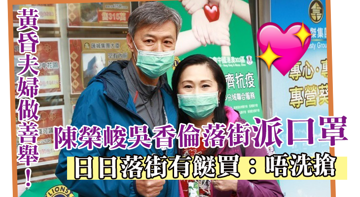 「黃昏夫婦」陳榮峻及吳香倫「夫妻檔」日前出外上陣齊齊派發口罩,二人表示口罩還有存貨:「有Fans喺外國寄咗兩盒口罩畀我哋,又有朋友去完旅行買畀我哋,不過都要同阿仔一齊用,要慳口罩都冇出街。(咪見唔到孫仔?)過年見咗,依家叫佢留喺屋企溫書。」