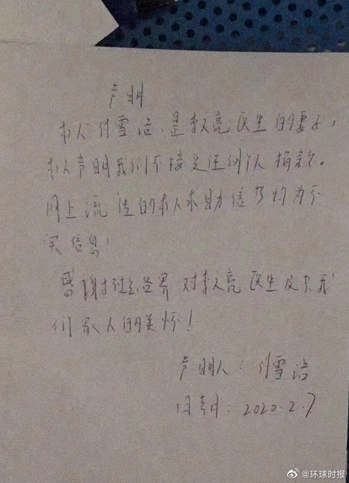 他又澄清,網上流傳的求助信並不是他們寫的。付雪潔之後亦發表聲明,指她不接受任何個人捐款,網上流傳的求助訊息均為不實訊息。