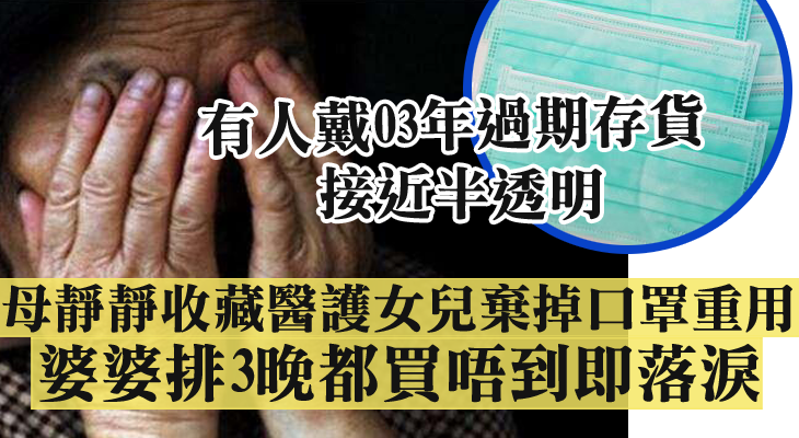 武漢肺炎疫情不斷擴大,市面上口罩嚴重短缺,不少市民為買口罩,不怕天寒地凍通宵排隊。沙田區議員陳運通昨在facebook分享三個疫情下的小故事,其中一名婆婆為家人買口罩排通宵,被發現暗中收起女兒有漬的舊口罩重用。