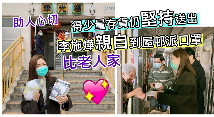 早前在社交網透露為了幫助有需要的人而提早上網訂購口罩的李施嬅,因為買下的貨遲遲都未到而感到無助,不過助人心切,她仍然把自己家中的少量存貨送出,與友人一同前往較多長者居住的地方,免費派發口罩助人!