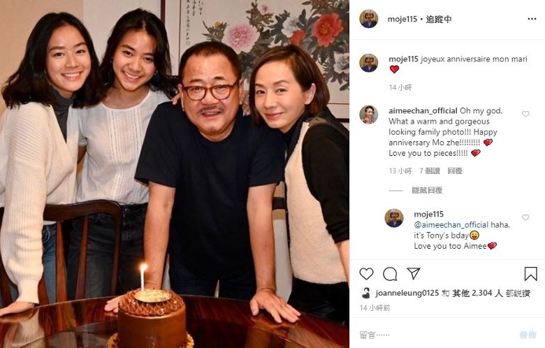 毛姐賀老公生日,不少圈中後輩都有留言,好像陳茵媺(Aimee)就留言︰「Oh my god. What a warm and gorgeous looking family photo!!! Happy anniversary Mo zhe!! Love you to pieces!!」