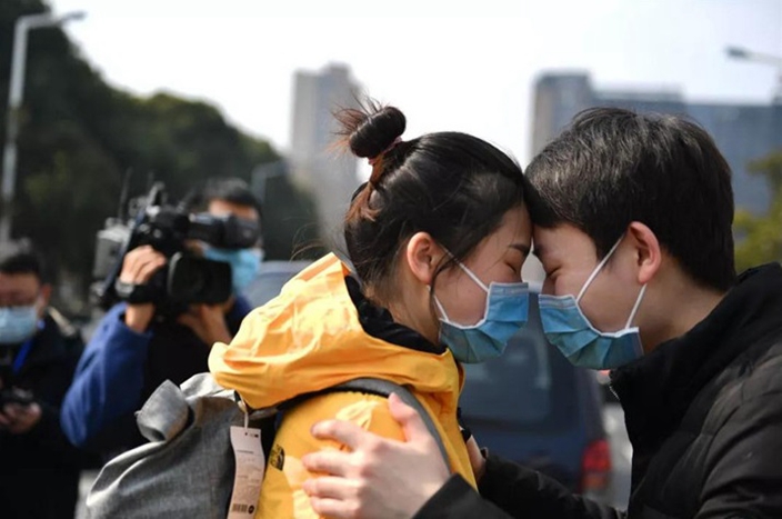正在攻讀博士的李洋也捉緊時間,與潘夢飛相擁告別,二人更約定,「等我平安回來就去領結婚證」,在媒體鏡頭的見證下親吻額頭。如此動人的一幕在微博上傳開,網友們看後都感動不已,紛紛留言鼓勵,希望所有人一切平安順利。