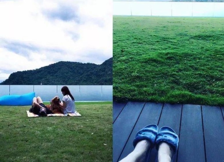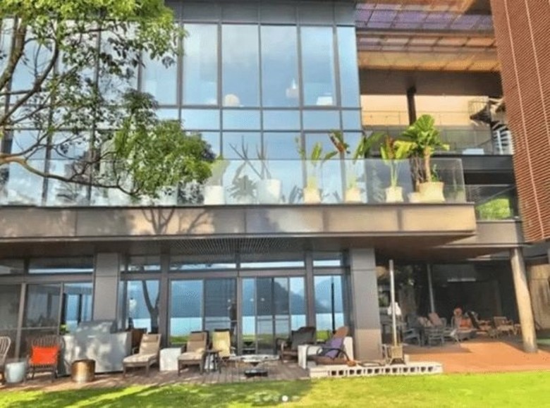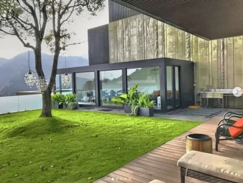 別墅外壁由玻璃幕牆設計,採光視野優越,從正面看,陽台上種滿各式各樣的闊葉植物,門前還有高大翠綠樹木,樹枝延伸到玻璃外壁,與陽台上的植物相呼應,生機盎然。前面有寬闊草坪和戶外庭院,草坪的樹上還掛着彩燈,夜景定必更美。