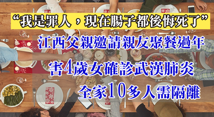 江西一名4歲女童確診新冠肺炎(武漢肺炎),全家10多人都需要隔離,其父親極為後悔表示:「千不該萬不該,就是不該串門(到別人家聊天)和聚餐。」