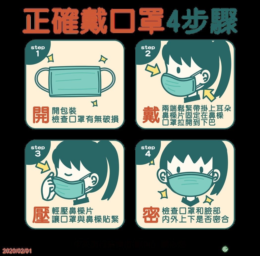 戴口罩4口訣:「開戴壓密」,(1)檢查口罩有沒有破損;(2)兩側鬆緊帶掛上耳朵,鼻樑片固定在鼻樑,口罩拉開到下巴;(3)輕壓鼻樑片,讓口罩與鼻樑貼緊;(4)檢查口罩和臉部內外上下是否有密合;(5)同一副口罩應只限同一個人重複使用,且應每天更換。
