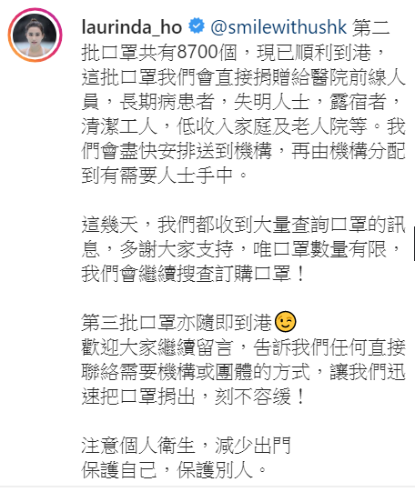 她補充道:「我們會盡快安排送到機構,再由機構分配到有需要人士手中。這幾天,我們都收到大量查詢口罩的訊息,多謝大家支持,唯口罩數量有限,我們會繼續搜查訂購口罩!第三批口罩亦隨即到港,歡迎大家繼續留言,吿訴我們任何直接聯絡需要機構或團體的方式,讓我們迅速把口罩捐出,刻不容緩!注意個人衛生,減少出門,保護自己,保護別人。口罩蓋著笑容但蓋不住愛和溫暖,希望你與我們共同散播微笑正能量。」