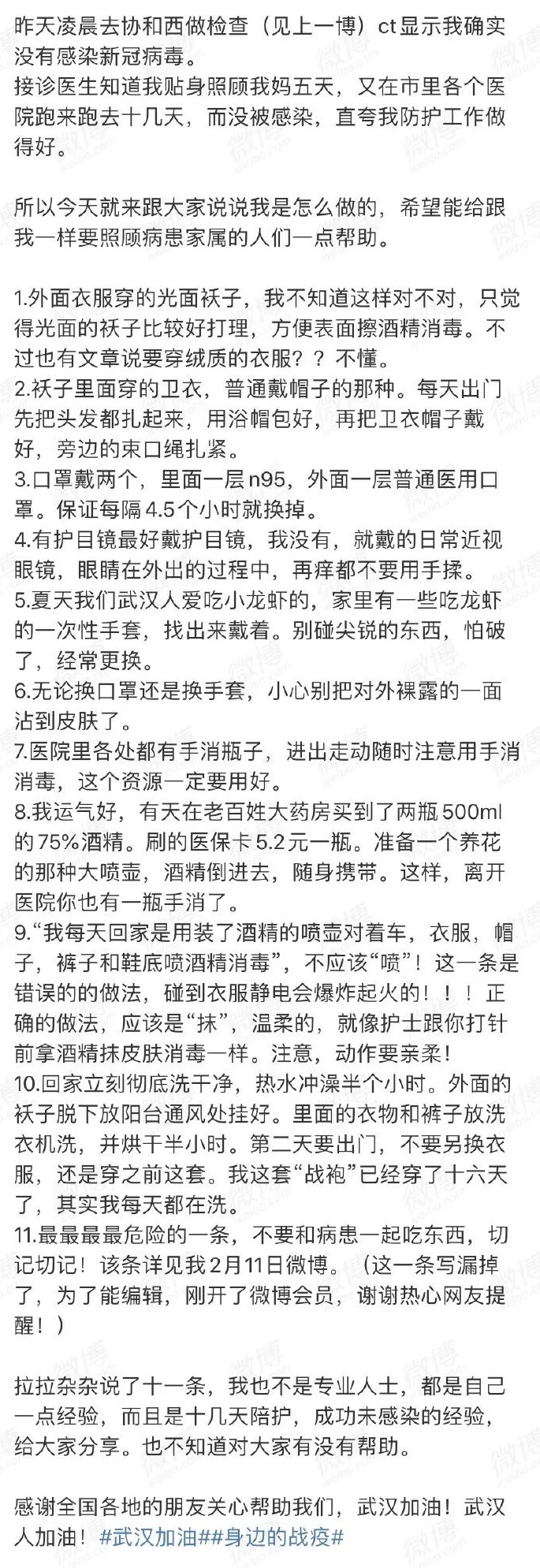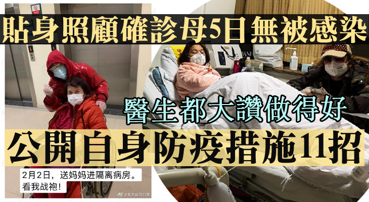 武漢肺炎持續,市民每日都忙於採購抗疫用品,最近一位武漢女子指自己陪伴及照顧了確診患新型冠狀病毒肺炎的媽媽10幾日,期間更貼身照顧5日,至今依然沒有感染,於是在微博與網民分享自身防疫措施11招!連接診醫生大讚她防疫工作做得好。