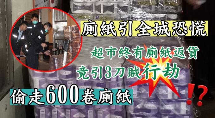 不過,他們的目標卻不是劫錢,反而是把大批的廁紙運走;據悉賊人劫去約50條廁紙,約600卷,其後以手推車推走,逃至洗衣街方向,職員之後報警。警員到場兜截無發現,正查看現場及附近一帶天眼錄影,了解案發經過及追緝賊人歸案。