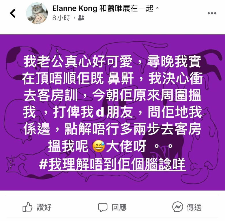 不過,她卻想想大爆老公經常有趣事發生,亦曾經說過老公的鼻鼾問題,導致她遲遲都未能入睡,要走到社交網上訴訴苦。
